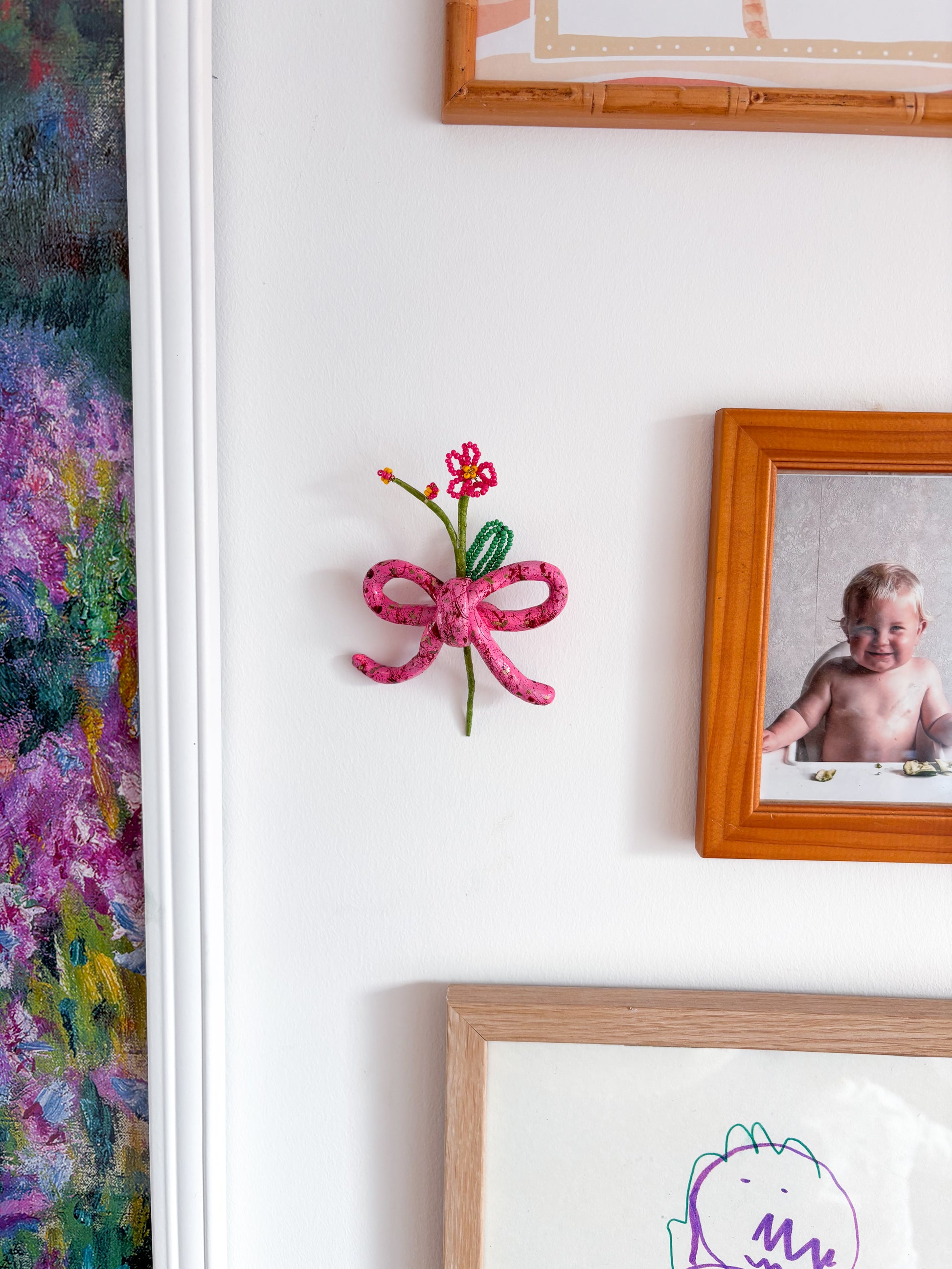 This beautiful hand sculpted, bright pink bow with a glass bead daisy makes the perfect accessory for any room. Perfect for a cosy chic feel, a little girls nursery or just because you love bows!
